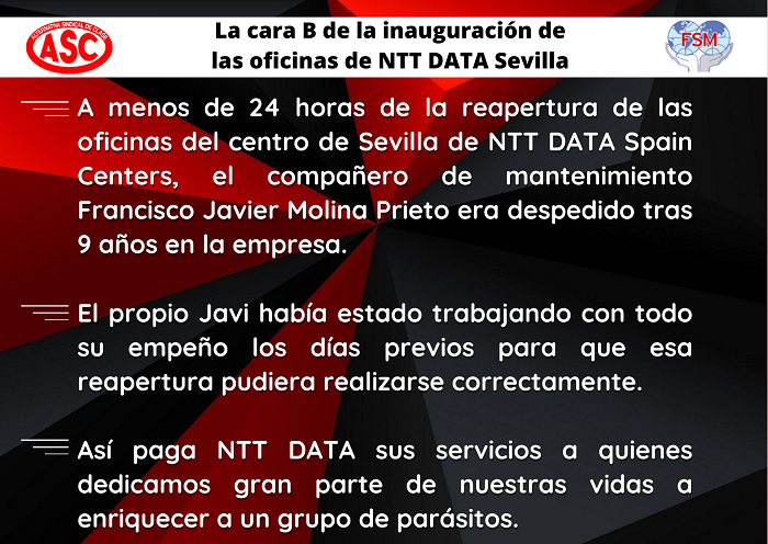 Desde la sección sindical de ASC en NTT DATA Spain Centers pensamos que para los trabajadores no hay ningún motivo de alegría para el brindis sino todo lo contrario y que tras la máscara de NTT DATA se esconde una verdad que necesita ocultar ante la plantilla con este tipo de actividades. Porque mientras que la empresa consigue automatizar miles de horas de trabajo al año, los trabajadores vemos como cada año se nos impone la jornada más alta del sector con 1800 horas anuales; porque mientras que la empresa se jacta de obtener unos beneficios millonarios (743,9 millones de euros en el último trimestre), los trabajadores sufrimos una pérdida general de poder adquisitivo del 32,45% entre 2020 y 2023; porque mientras que la empresa promociona más de 40 nuevos directores y manager en el último año, en el lado de los trabajadores se suceden decenas de despidos disciplinarios que la misma empresa reconoce cínicamente como improcedentes; porque mientras que la empresa actúa con total impunidad judicial saltándose las leyes a su antojo, a los trabajadores nos reprime sindicalmente para no poder organizarnos desde una perspectiva de clase.